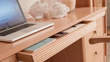 Это история, поэтически выраженная в коллекции Onda с помощью деревянного массива, история, алфавитом для которой служит мастерство краснодеревщиков в резьбе и создании эффекта «декапе», чтобы подчеркнуть каждую деталь резьбы и сохранить  теплые нотки натуральной текстуры красного дерева.