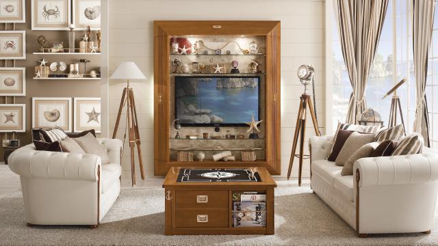 Интерьер можно дополнить гарнитуром диванов Chester из натуральной кожи цвета слоновой кости и столиком Lounge с зеркальной столешницей. Для ценителей истинного морского стиля компания Caroti создала облицовку для камина из каррарского мрамора белого цвета с барельефами и гравировкой.