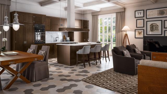 Кухонная мебель является модульной и подходит для установки разнообразной встраиваемой техники (холодильника, винного шкафа, духовки, кофемашины) и одинарных или двойных моек различных размеров в зависимости от пожеланий заказчика. Кухня состоит из модульных элементов и может быть расширена по желанию клиента с помощью контейнеров, ниш, подвесных элементов с откидными механизмами и корзинами с технологией blue-motion.